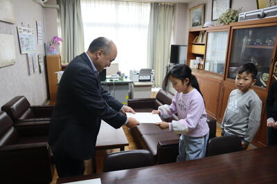 受賞した児童については、伊東市から賞状及び記念品が学校に届いたので、