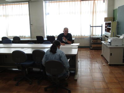 写真は、4~6年生の担任の先生方が、通知表を渡している様子です。